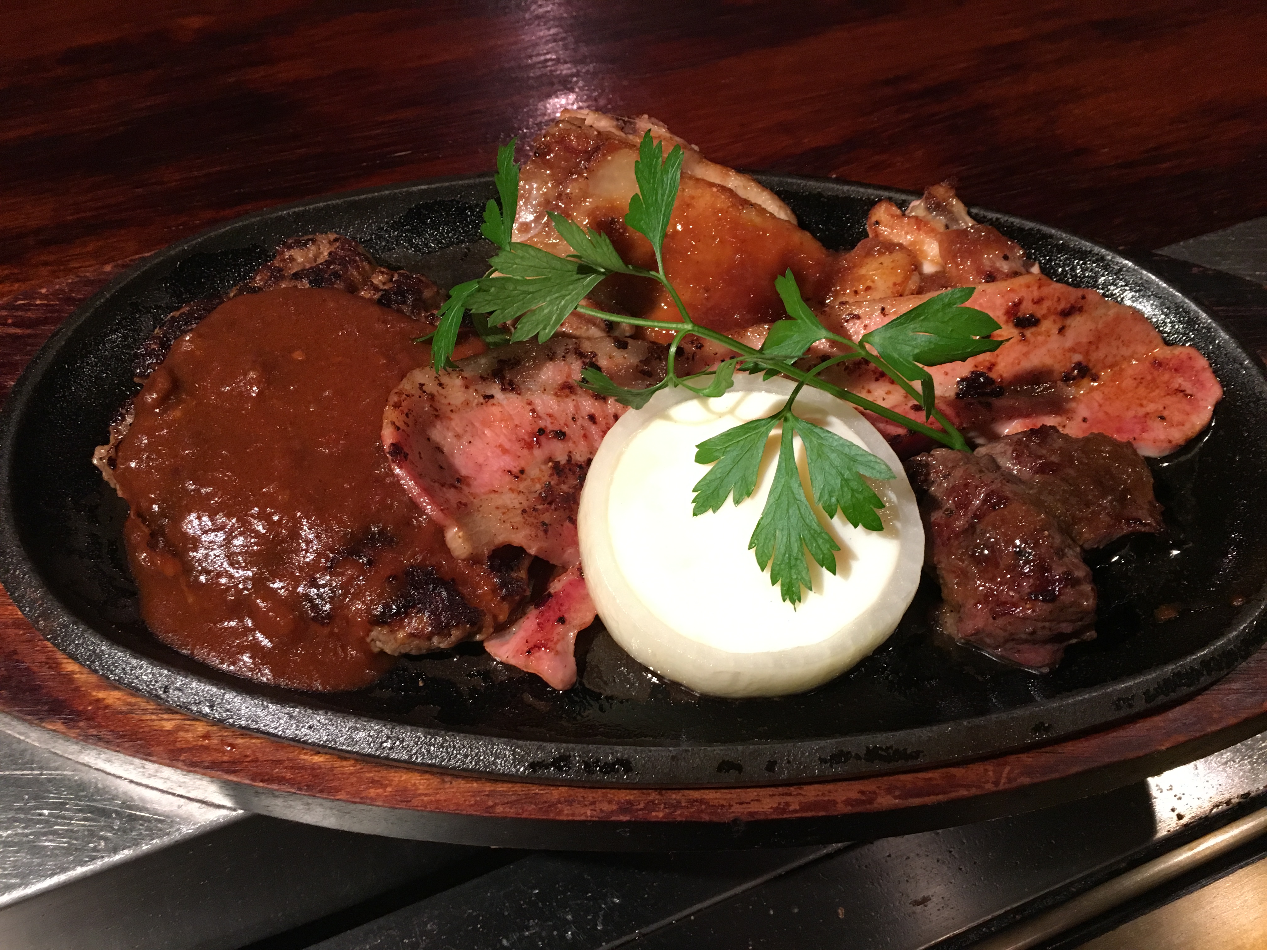 和牛入りハンバーグ&若鶏ソテー、ベーコンソテー、ハラミ肉、オニオンエッグがワンプレートに!!